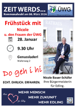 Unsere Bürgermeisterkandidatin, Nicole Bauer-Schäfer, freut sich sehr, Sie und euch am Mittwoch, 28. Januar im Genussladerl um 9:30 Uhr zum Frühstück zu begrüßen. Zusammen mit unseren weiteren Kandidatinnen wird sie gerne ihre Anmerkungen zur aktuellen Gemeindepolitik und ihre Vorstellungen sowie Ziele zur zukünftigen Gemeindepolitik mit Ihnen diskutieren.